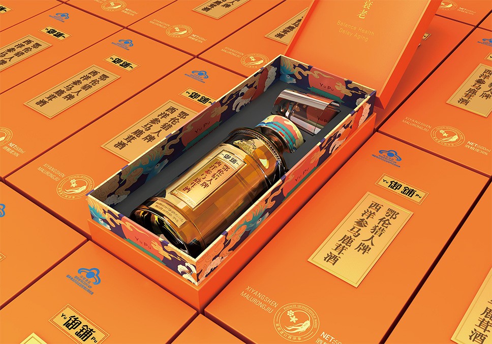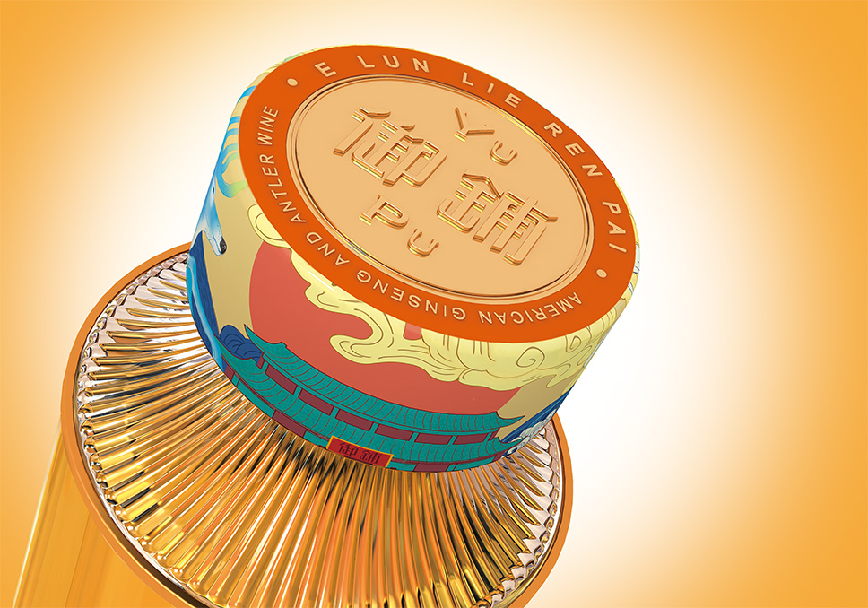 瓶口的圖案是由馬鹿茸、西洋參、中藥鋪、祥云、水紋等元素中提煉出來馬鹿茸,西洋參是中醫(yī)藥的珍品能夠體現(xiàn)產(chǎn)品的屬性;中藥鋪增加產(chǎn)品在醫(yī)藥中體現(xiàn)的價值感;祥云、水紋在傳統(tǒng)元素寓意祥瑞之云氣,表達(dá)了吉祥、喜慶、幸福的愿望以及對生命的美好向往,同樣把美好的寄寓應(yīng)用瓶口的包裝上。