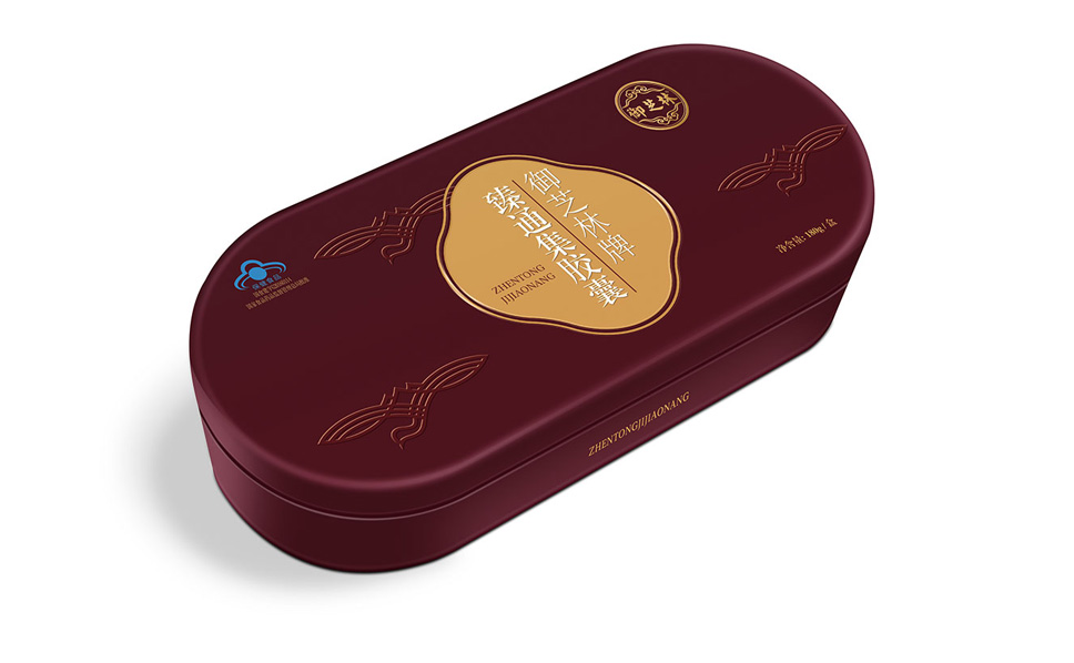 臻通集膠囊的定位人群為中老年人,具有輔助降血脂、增強免疫力的保健功能,李華清通過前期的分析,在視覺表現上運用樹、心形、頭腦、手等元素進行組合,形成臻通集膠囊戰略元素,達到視覺聚焦效果,抽象畫的圖形,用金色戰略色彩體現,更具有品質感。
