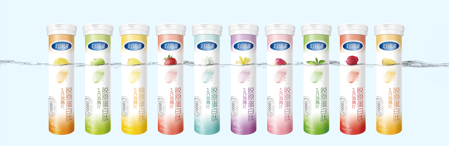 泡騰片放入水中迅速升騰起無數氣泡的一瞬間,美妙化作唯美的味道,讓身體里每個細胞迅速蘇醒,提供一天能量所需。是包裝創意的主題,讓消費者直觀的感受到產品的神奇力量,彰顯品牌的青春與活力。系列產品在終端成列中形成靚麗的視覺聚焦點,同時為后期的宣傳片拍攝提供了創意腳本。