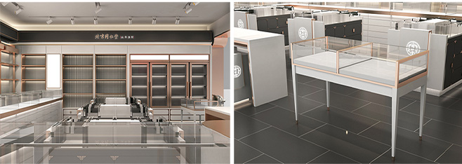 李華清為同仁堂參茸專賣店色彩定位采用了深灰、白和玫瑰金色搭配,使整體店面既有富麗堂皇之氣場,也有清新脫俗之雅韻。一方面與北京同仁堂傳統店面形象區分開來,另一方面,在傳承傳統文化的同時也對同仁堂文化和形象都進行了升華,使其店面更具視覺特點和識別性傳統出透露出的現代和時尚,符合未來人群的審美情趣。